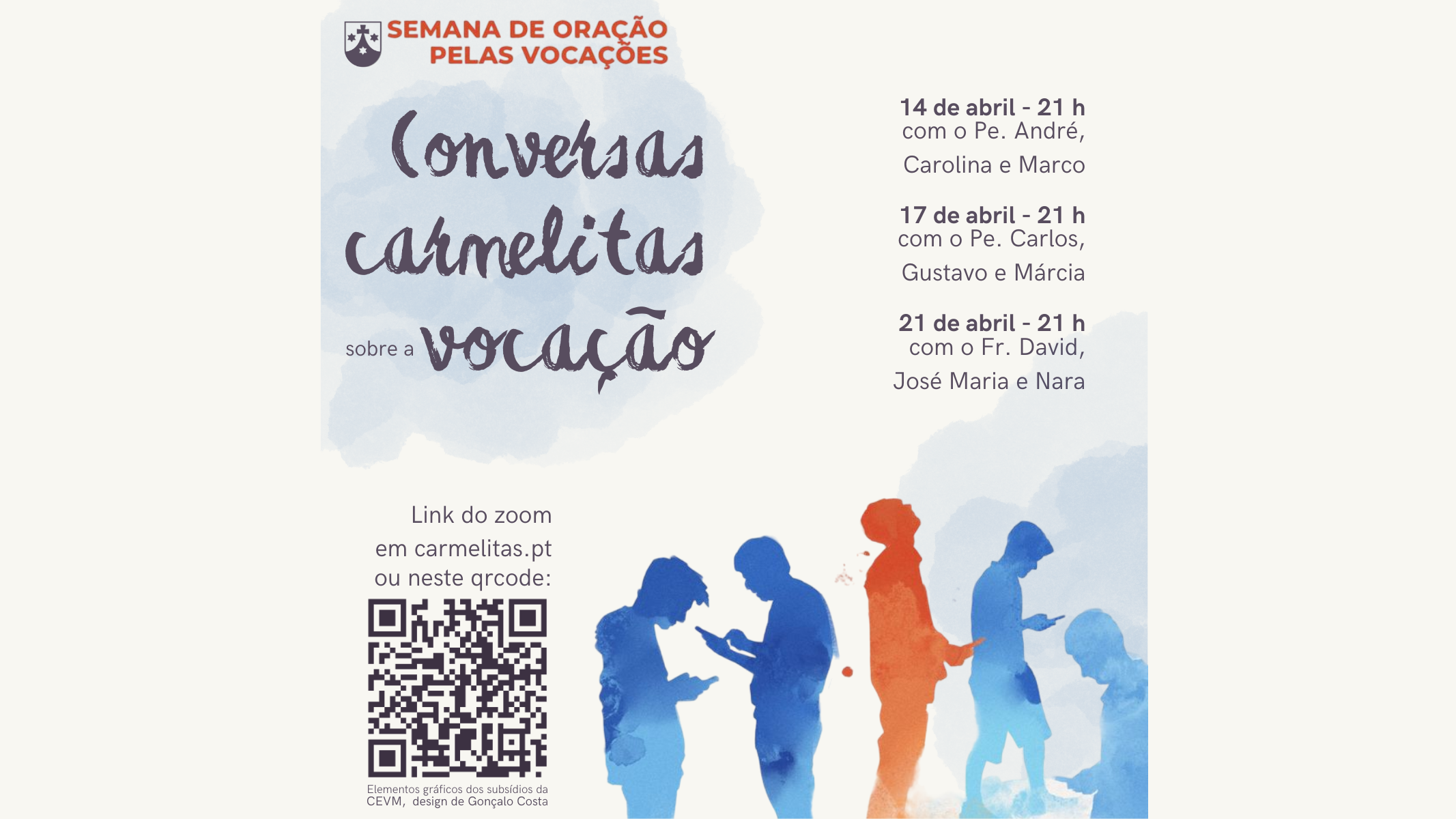 De 14 a 21 de abril, a Igreja vive a Semana de Oração pelas Vocações. A pergunta “Para quem sou?”, extraída da Exortação Apostólica do Papa Francisco aos jovens, “Cristo vive” (nº 286), serve de mote a esta iniciativa em Portugal. A Ordem dos Carmelitas Descalços assinalará esta semana com as “Conversas carmelitas sobre a vocação”. Este ciclo de diálogos entre membros da família carmelita decorrerá online, através da plataforma zoom, nos dias 14, 17 e 21 de abril, sempre pelas 21 horas. O carmelita Pe. André Morais, ordenado em julho de 2023, e o jovem casal Carolina e Marco Freitas da Silva, que celebraram o seu matrimónio em dezembro de 2023, inaugurarão o ciclo, com um diálogo acerca de como são os primeiros tempos depois de assumir um projeto vocacional. No dia 17 de abril, o carmelita Pe. Carlos Vieira e o casal Márcia Vieira e Gustavo Borges, carmelitas seculares, irão conversar acerca do que é a vocação e dos caminhos para a descobrir e assumir. Para encerrar a semana, no dia 21 de abril, será a vez do jovem carmelita Frei David Esteves e do casal de namorados José Maria Canotilho e Nara Costa conversarem sobre o namoro e a formação para a vida religiosa como caminhos para uma grande decisão vocacional.